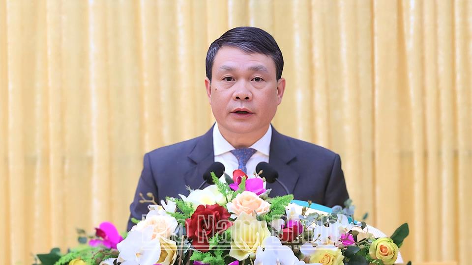 | Đồng chí Chủ tịch UBND tỉnh Phạm Đình Nghị phát biểu tại hội nghị. |