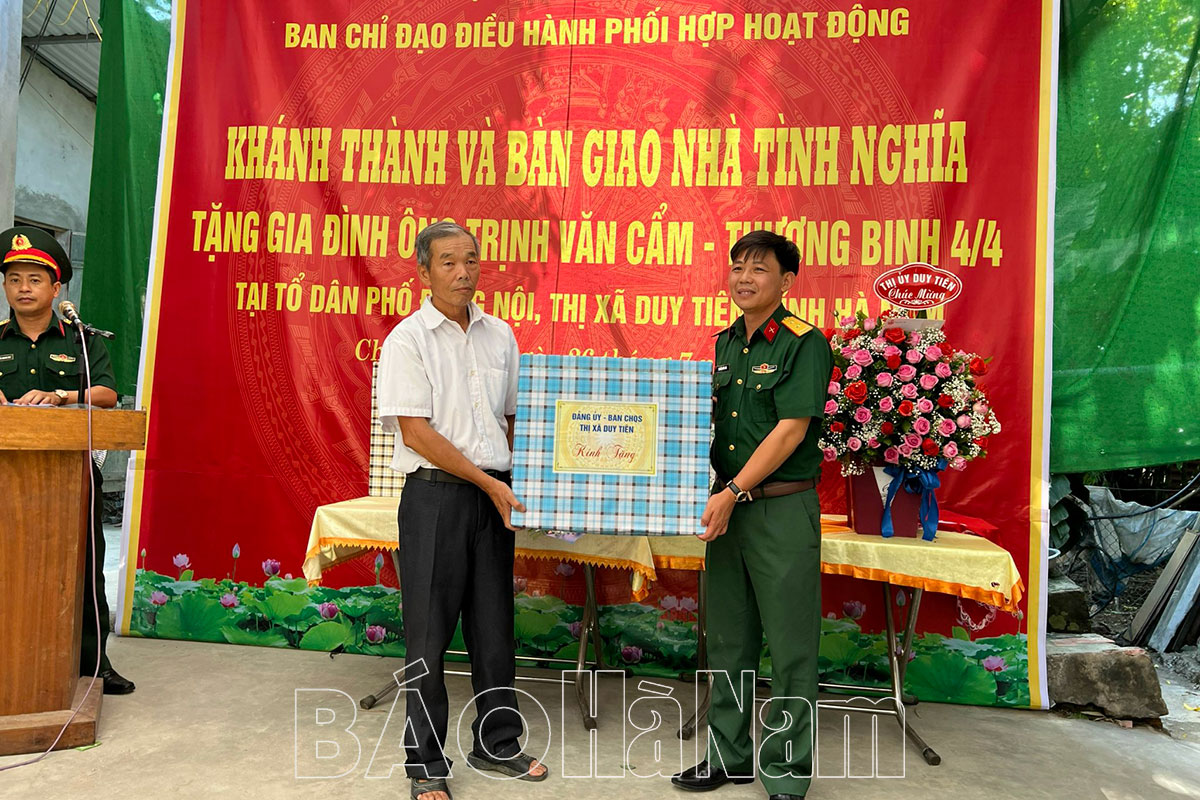 Kỷ niệm 75 năm Ngày Thương binh liệt sĩ (27/7/1947-27/7/2022), sáng 26/7, Ban chỉ đạo chương trình phối hợp hoạt động thị xã Duy Tiên (gồm các đơn vị: Ban Dân vận – MTTQ, Ban CHQS và các ban, ngành, đoàn thể thị xã) đã tổ chức khánh thành, bàn giao nhà tình nghĩa tặng gia đình ông Trịnh Văn Cẩm, thương binh hạng 4/4 tại tổ dân phố Đông Nội, phường Châu Giang.