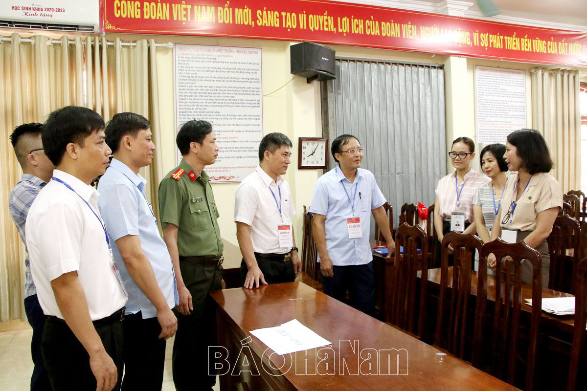 Các đồng chí trong đoàn công tác của BCĐ các kỳ thi của tỉnh năm 2024 kiểm tra điểm thi trường THPT C Bình Lục.