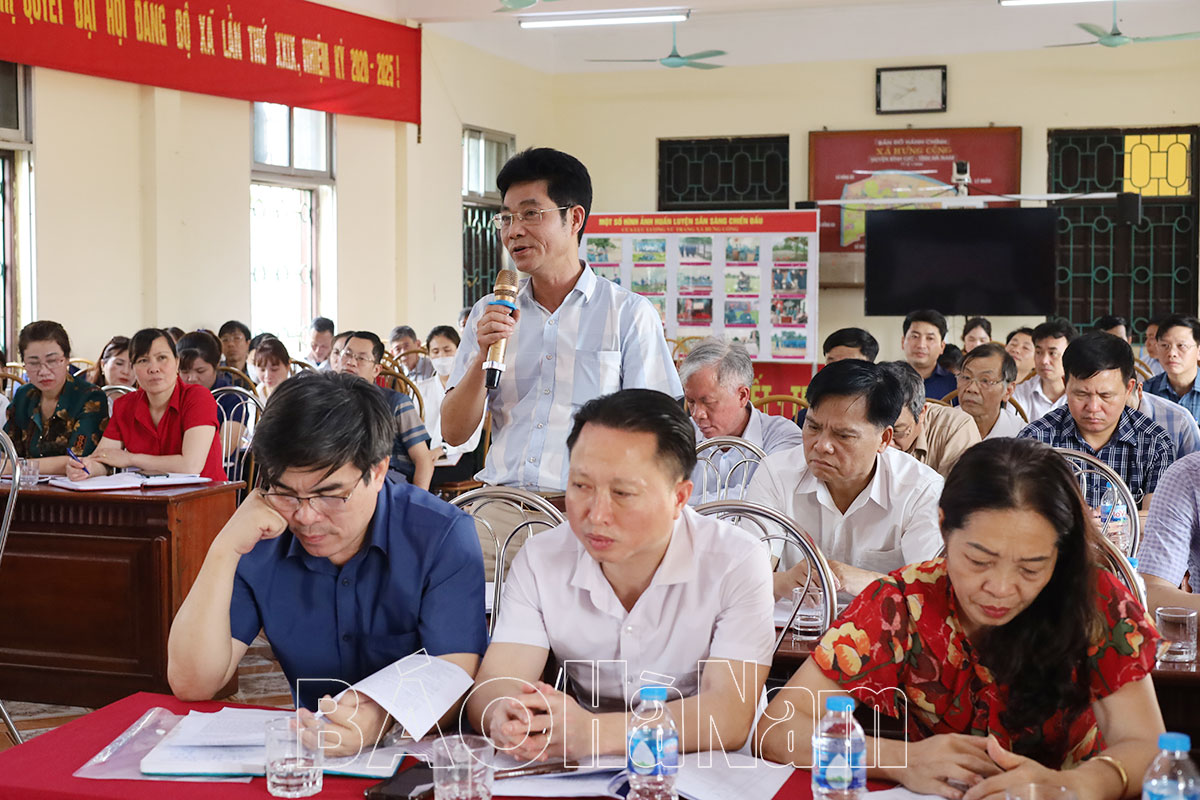 Thành viên BCĐ xây dựng NTM nâng cao huyện Bình Lục đóng góp ý kiến về các giải pháp đẩy nhanh tiến độ xây dựng NTM nâng cao tại xã Hưng Công.