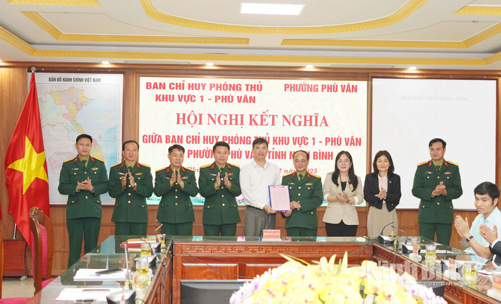 Lãnh đạo Ban Chỉ huy PTKV 1-Phù Vân và lãnh đạo phường Phù Vân ký kết Biên bản chương trình phối hợp, kết nghĩa giữa hai bên.