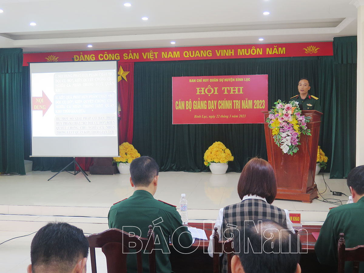 Ngày 22/3, Ban CHQS huyện Bình Lục tổ chức hội thi cán bộ giảng dạy chính trị trong lực lượng vũ trang (LLVT). Tham gia hội thi có 7 cán bộ là Trợ lý chính trị Ban CHQS huyện và chính trị viên, chính trị viên phó Ban CHQS các xã, thị trấn trên địa bàn huyện đã qua vòng thi sơ khảo ở cơ sở.