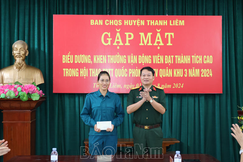 Ban CHQS huyện Thanh Liêm vừa tổ chức gặp mặt biểu dương, khen thưởng, động viên các chiến sĩ dân quân tự vệ đạt thành tích cao trong Hội thao thể dục thể thao (TDTT) quốc phòng dân quân tự vệ Quân khu 3 năm 2024.