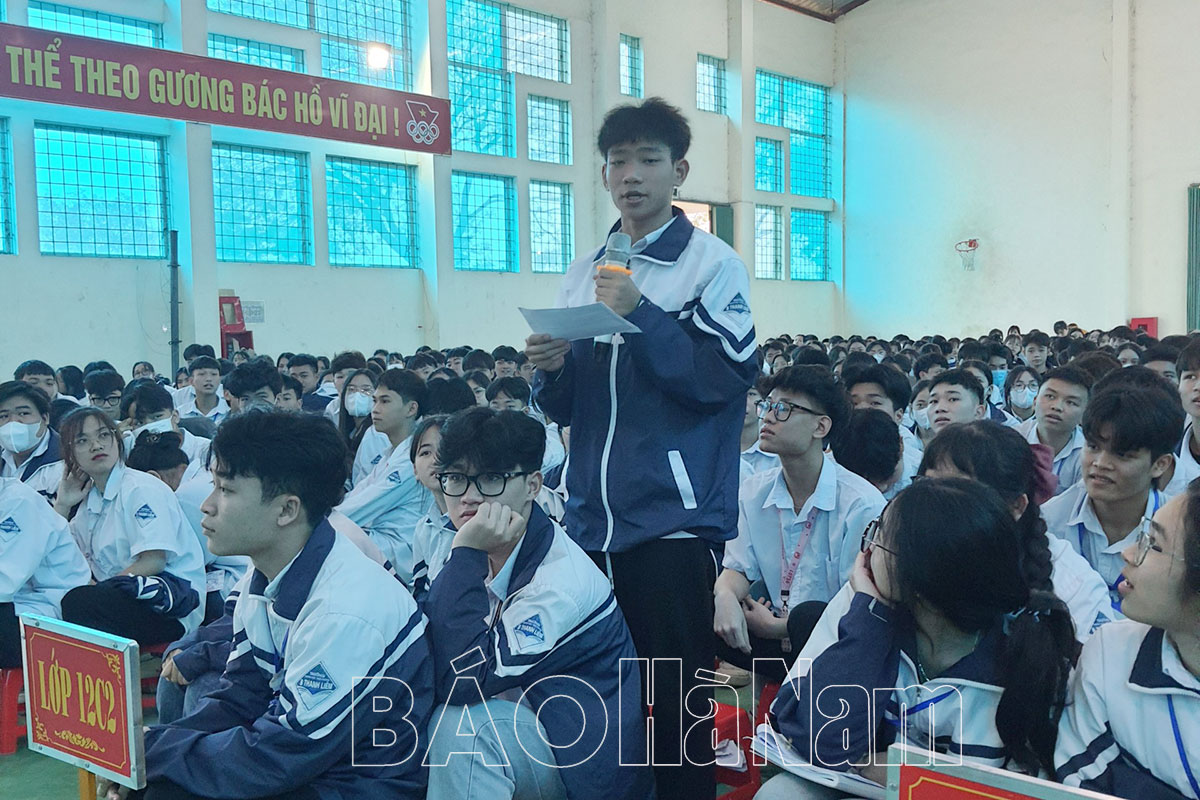 Các em học sinh đặt câu hỏi với cán bộ tuyển sinh quân sự huyện Thanh Liêm.