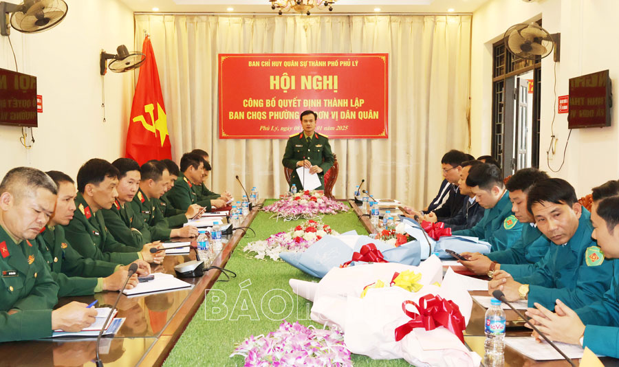 Tại hội nghị, Ban CHQS thành phố Phủ Lý đã công bố quyết định của Chỉ huy trưởng Bộ CHQS tỉnh về thành lập các ban CHQS xã, phường trên địa bàn theo chủ trương sắp xếp đơn vị hành chính cấp huyện, cấp xã của tỉnh Hà Nam giai đoạn 2023-2025 theo Nghị quyết số 1288/NQ-UBTVQH15 ngày 14/11/2024 của Ủy ban Thường vụ Quốc hội. Theo đó, thành phố có 3 ban CHQS cấp xã được thành lập mới gồm: Ban CHQS phường Châu Cầu; Ban CHQS phường Tân Liêm; Ban CHQS phường Tân Hiệp.