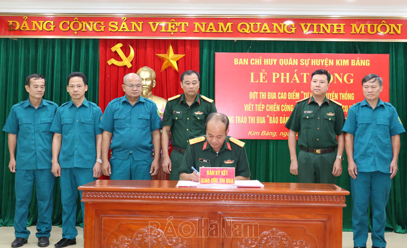 Lãnh đạo Ban CHQS huyện Kim Bảng và các đơn vị ký kết thi đua cao điểm.