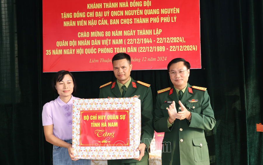 Sáng 5/12, tại thôn Lau Chảy, xã Liêm Thuận, huyện Thanh Liêm, Ban CHQS thành phố Phủ Lý tổ chức khánh thành bàn giao “Nhà đồng đội” tặng gia đình Đại uý, quân nhân chuyên nghiệp (QNCN) Nguyễn Quang Nguyên, nhân viên Hậu cần, Ban CHQS thành phố. Dự khánh thành có các đồng chí lãnh đạo Bộ CHQS tỉnh, thành phố Phủ Lý và cấp ủy, chính quyền địa phương.
