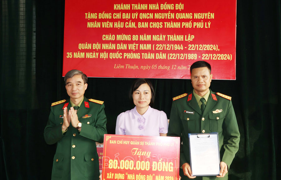 Được biết, trong năm 2024, Ban CHQS thành phố đã triển khai trao kinh phí hỗ trợ xây dựng 5 căn “Nhà tình nghĩa”, “Nhà đồng đội”, “Nhà đại đoàn kết” tặng các gia đình chính sách, QNCN và hộ nghèo trên địa bàn. Đây cũng là một trong những hoạt động ý nghĩa nhân dịp kỷ niệm 80 năm Ngày thành lập Quân đội nhân dân Việt Nam, 35 năm Ngày hội Quốc phòng toàn dân của cán bộ, chiến sĩ Ban CHQS thành phố Phủ Lý.