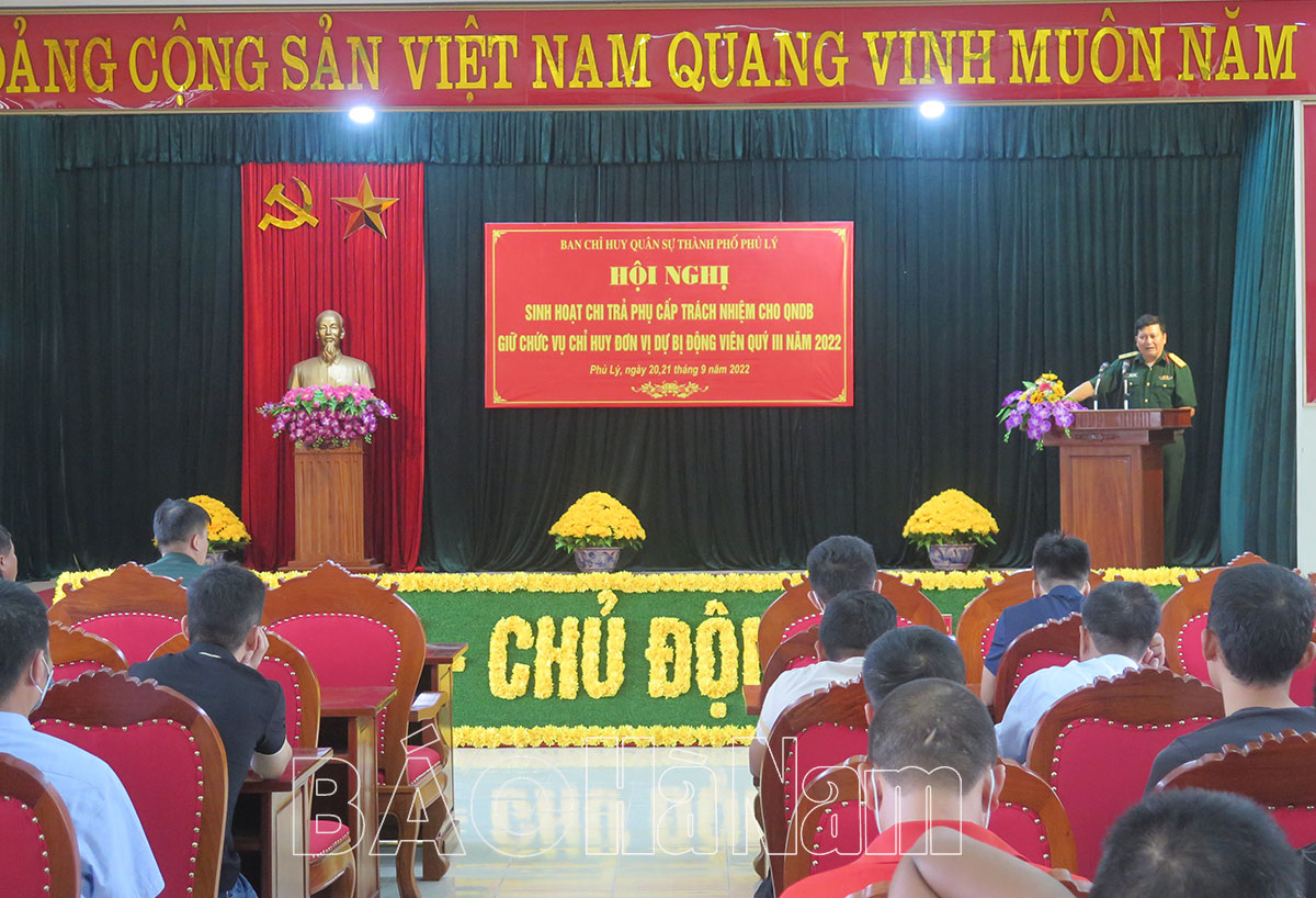 Theo kế hoạch, trong 2 ngày (20 và 21/9), thành phố có 460 QNDB các đơn vị được chi trả chế độ với tổng số tiền 252 triệu đồng. Việc sinh hoạt và chi trả chế độ phụ cấp trách nhiệm cho đội ngũ QNDB giữ chức vụ chỉ huy đơn vị dự bị động viên được Ban CHQS thành phố Phủ Lý duy trì đều đặn hằng quý đảm bảo chặt chẽ, đúng đối tượng.