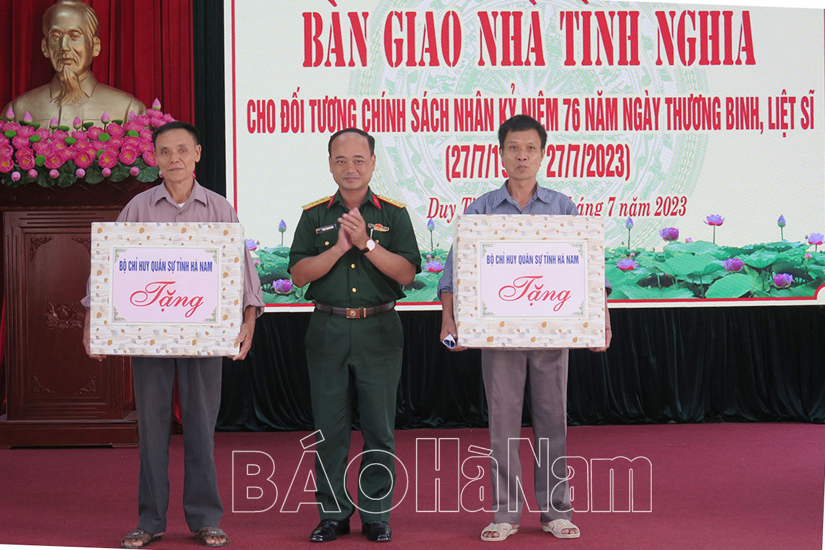 Hướng tới kỷ niệm 76 năm Ngày Thương binh liệt sĩ (27/7/1947 - 27/72023), sáng 14/7, Ban CHQS thị xã Duy Tiên phối hợp với Cục Kế hoạch và Đầu tư Bộ Quốc phòng tổ chức khánh thành, bàn giao nhà tình nghĩa cho đối tượng chính sách.