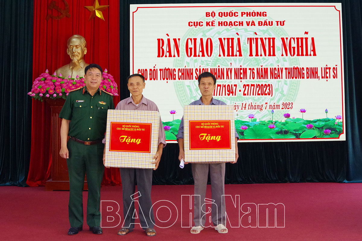 Thiếu tướng Nguyễn Hồng Lâm, Cục trưởng Cục Kế hoạch và Đầu tư Bộ Quốc phòng tặng quà 2 gia đình chính sách.Đại diện Bộ CHQS tỉnh tặng quà 2 gia đình chính sách.Đại diện Ban CHQS thị xã Duy Tiên tặng quà 2 gia đình.