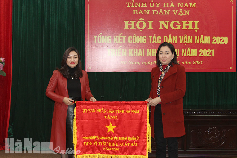 Đồng chí Đinh Thị Lụa, Phó Bí thư Thường trực Tỉnh ủy trao Cờ đơn vị tiêu biểu xuất sắc năm 2020 của UBND tỉnh cho phòng Nghiệp vụ Công tác Dân vận- Ban Dân vận Tỉnh ủy.Đồng chí Đinh Văn An, Ủy viên BTV Tỉnh ủy, Trưởng Ban Dân vận Tỉnh ủy trao Giấy khen cho đại diện các đơn vị hoàn thành xuất sắc nhiệm vụ năm 2020.