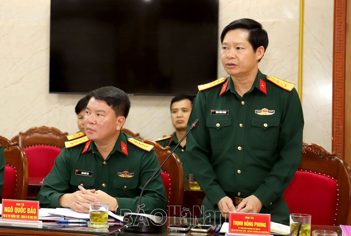 Đại tá Trịnh Hồng Phong, Ủy viên BTV Tỉnh uỷ, Chỉ huy trưởng Bộ CHQS tỉnh phát biểu tại hội nghị.
