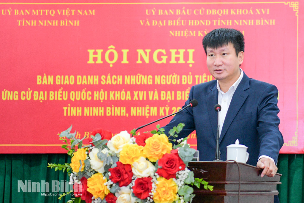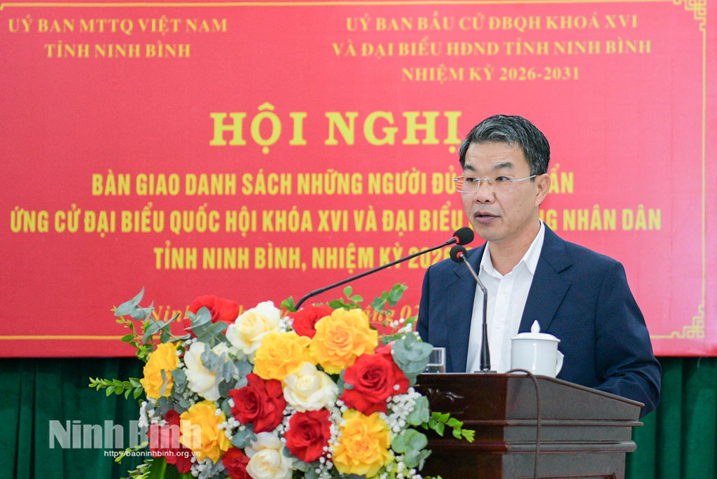 Đồng chí nhấn mạnh, danh sách những người ứng cử không chỉ bảo đảm về số lượng, cơ cấu, thành phần, tỷ lệ đại biểu trẻ, đại biểu nữ, đại biểu là người ngoài Đảng, mà còn đặc biệt coi trọng chất lượng. Những người được giới thiệu ứng cử đều là những cá nhân có bản lĩnh chính trị vững vàng, quá trình rèn luyện, phấn đấu nghiêm túc; có uy tín, đạo đức, lối sống, tinh thần trách nhiệm, ý thức giữ gìn đoàn kết nội bộ và mối quan hệ gắn bó với Nhân dân nơi cư trú; đủ tiêu chuẩn, điều kiện để đại diện cho ý chí, nguyện vọng của cử tri tham gia đại biểu Quốc hội khóa XVI và đại biểu HĐND tỉnh Ninh Bình nhiệm kỳ 2026-2031.