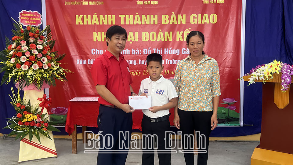 Sáng 12-10, Hội Chữ thập đỏ (CTĐ) tỉnh phối hợp với MTTQ tỉnh, Ngân hàng Nông nghiệp và Phát triển nông thôn chi nhánh Nam Định tổ chức lễ khánh thành, bàn giao nhà Đại đoàn kết cho gia đình bà Đỗ Thị Hồng Gấm, xóm Đội 4, xã Xuân Thượng (Xuân Trường).