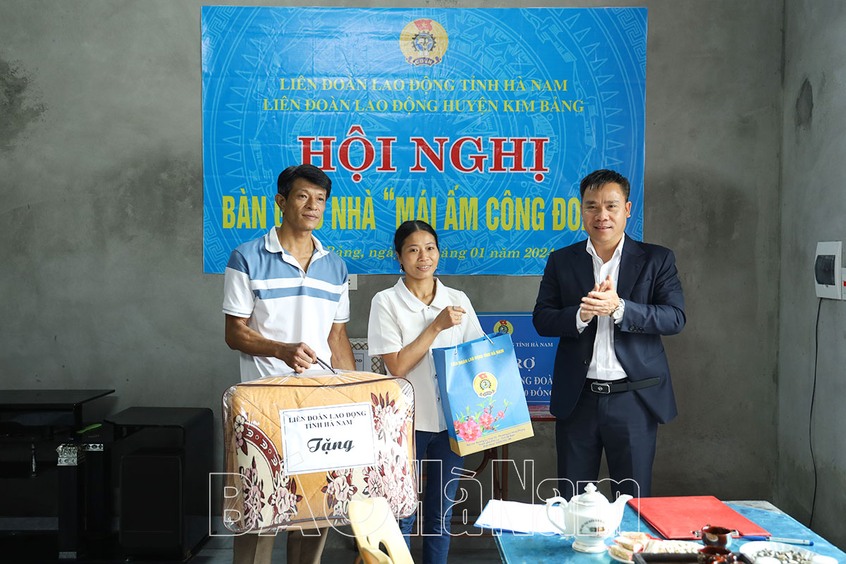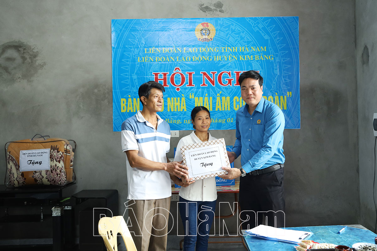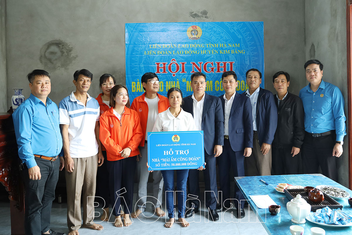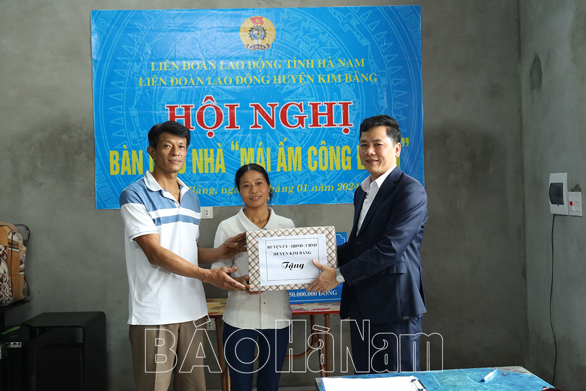 Tại hội nghị, LĐLĐ tỉnh đã trao tặng 50 triệu đồng kinh phí hỗ trợ xây dựng nhà “Mái ấm Công đoàn” cho gia đình chị Trần Thị Huệ cùng các phần quà ý nghĩa. Huyện ủy, HĐND, UBND huyện, LĐLĐ huyện Kim Bảng cũng có những phần quà chúc mừng gia đình chị Huệ đã xây dựng được ngôi nhà mới khang trang.