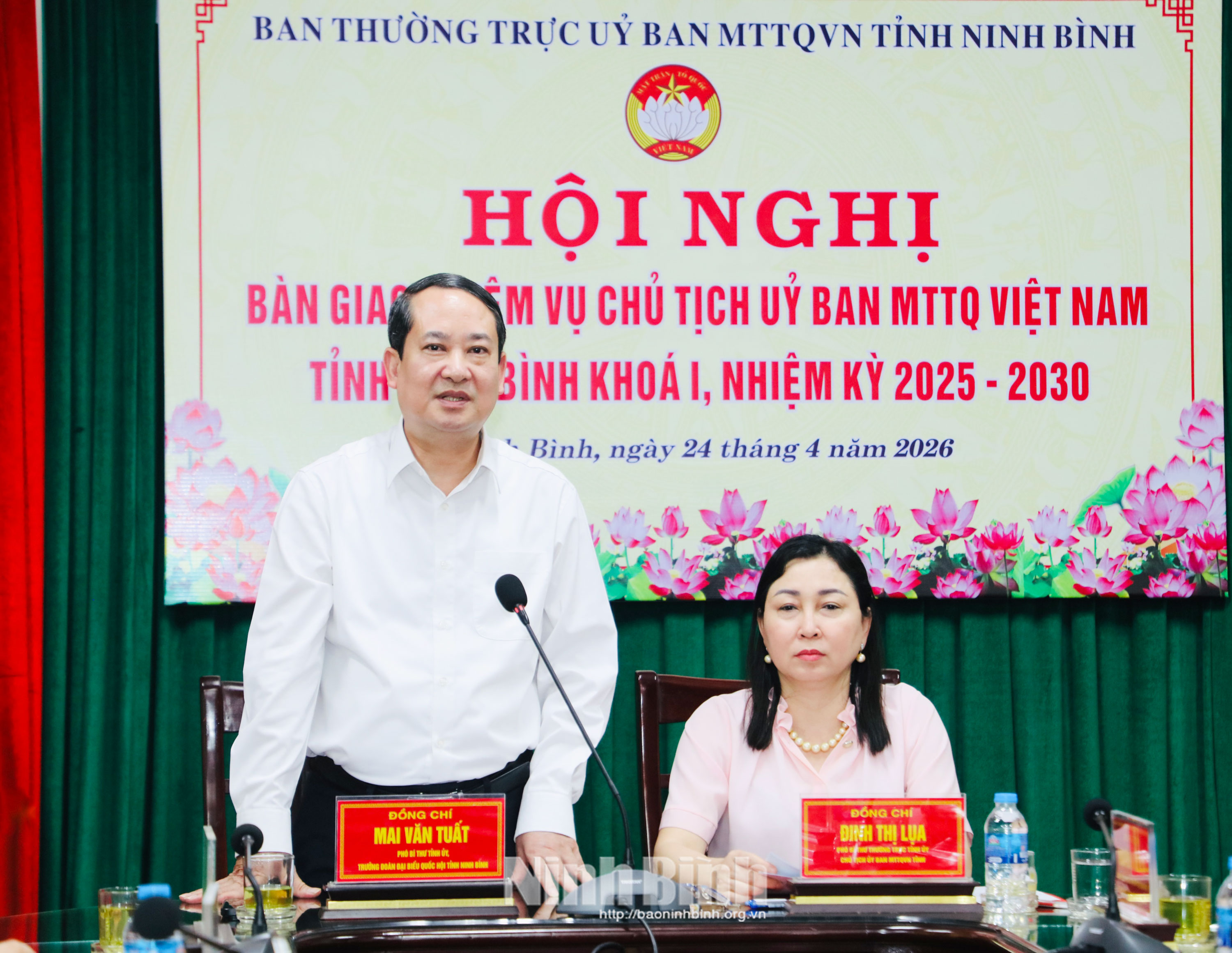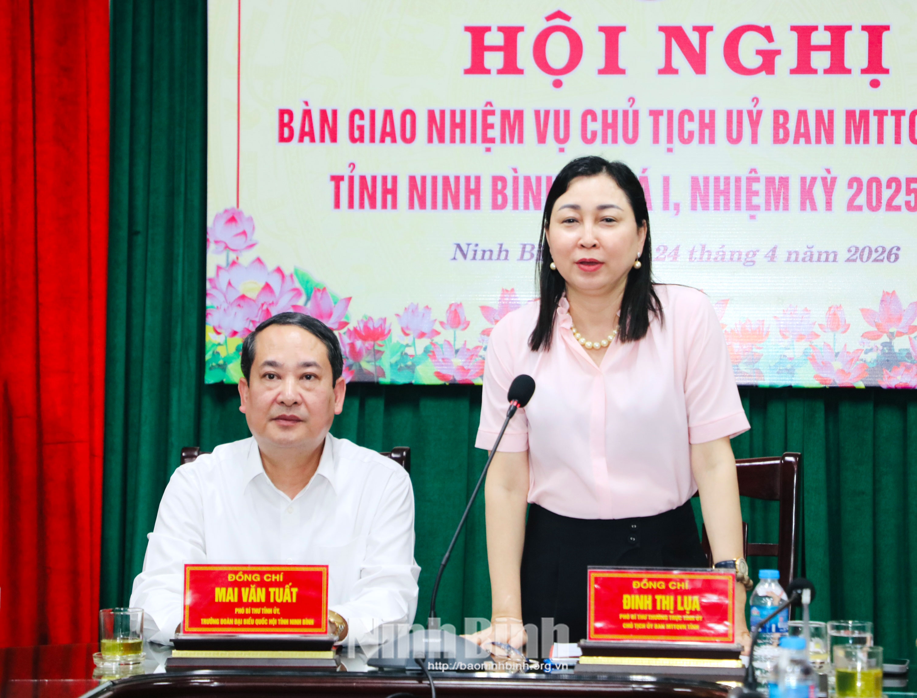 Đồng chí Đinh Thị Lụa, Phó Bí thư Thường trực Tỉnh ủy, Chủ tịch Ủy ban MTTQ Việt Nam tỉnh và đồng chí Mai Văn Tuất, Phó Bí thư Tỉnh ủy, Trưởng Đoàn ĐBQH tỉnh ký biên bản bàn giao nhiệm vụ Chủ tịch Ủy ban MTTQ Việt Nam tỉnh.