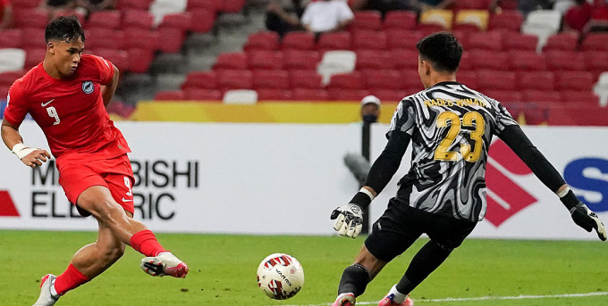 Tình huống Ikhsan sút gỡ hoà 1-1 cho Singapore trước Indonesia, ở bán kết lượt đi AFF Cup 2020 trên sân Kallang, Singapore tối 22/12. Ảnh: FAS