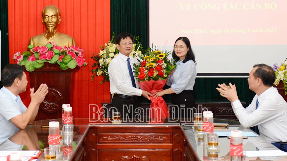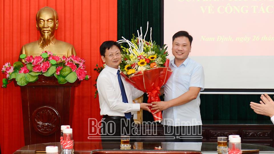 | Lãnh đạo Ban Tổ chức Tỉnh ủy tặng hoa chúc mừng tân Phó Trưởng Ban Nội chính Tỉnh ủy Phạm Quang Hùng. |