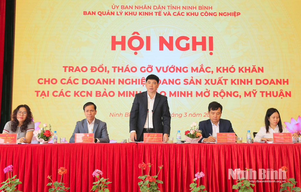 Ngày 30/3, Ban Quản lý Khu kinh tế và các khu công nghiệp (KCN) tỉnh Ninh Bình tổ chức hội nghị trao đổi, tháo gỡ vướng mắc, khó khăn cho các doanh nghiệp đang hoạt động tại KCN Bảo Minh, KCN Bảo Minh mở rộng và KCN Mỹ Thuận.