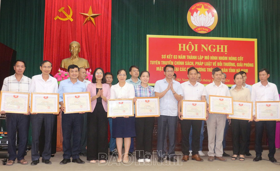 Chủ tịch Ủy ban MTTQ tỉnh tặng Bằng khen cho các tập thể, cá nhân có thành tích xuất sắc trong nhóm nòng cốt tuyên truyền chính sách, pháp luật về bồi thường GPMB.
