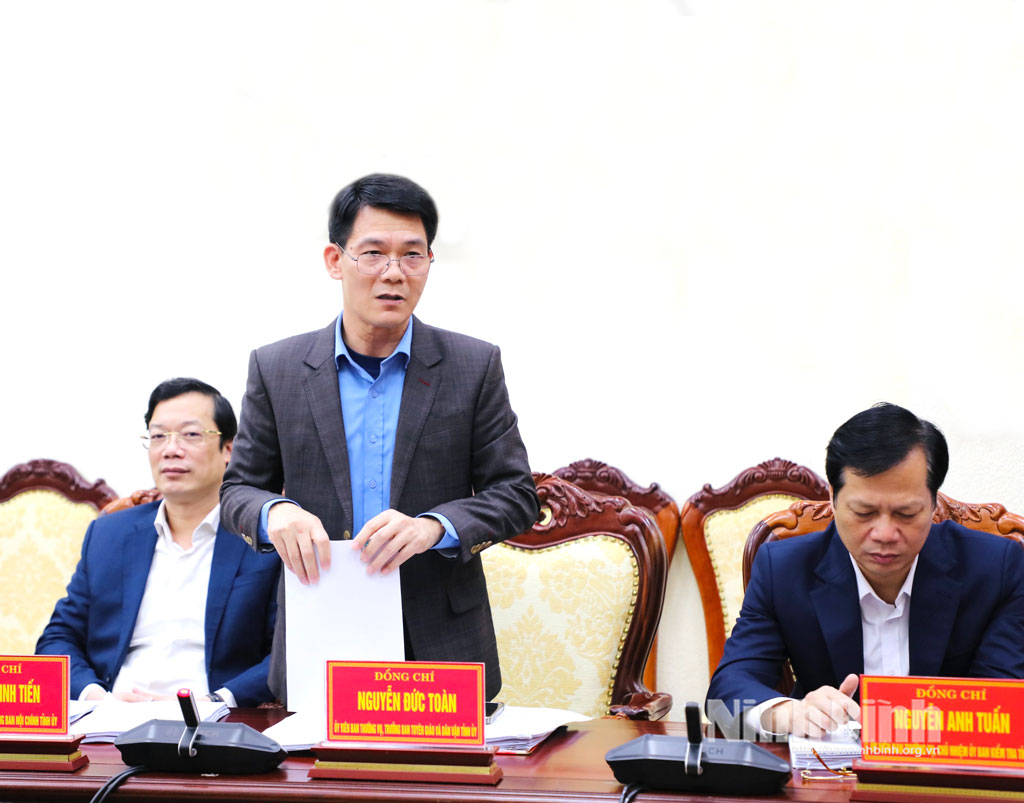 Đồng chí Nguyễn Đức Toàn, Ủy viên Ban Thường vụ Tỉnh ủy, Trưởng Ban Tuyên giáo và Dân vận Tỉnh ủy phát biểu tại hội nghị.