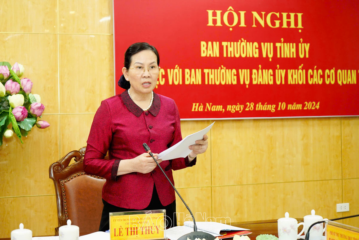 Chiều 28/10, Ban Thường vụ (BTV) Tỉnh ủy tổ chức hội nghị làm việc với BTV Đảng ủy Khối các cơ quan (CCQ) tỉnh về kết quả thực hiện Nghị quyết Đại hội Đảng bộ Khối CCQ tỉnh lần thứ VI, nhiệm kỳ 2020-2025 và thực hiện Kết luận số 208-KL/TU, ngày 27/3/2023, Kết luận số 211-KL/TU, ngày 28/3/2023 của BTV Tỉnh uỷ về kiểm điểm giữa nhiệm kỳ 2020-2025. Đồng chí Lê Thị Thủy, Ủy viên Trung ương Đảng, Bí thư Tỉnh ủy, Chủ tịch HĐND tỉnh chủ trì hội nghị. Dự hội nghị có đồng chí Đinh Thị Lụa, Phó Bí thư Thường trực Tỉnh ủy; các đồng chí Ủy viên BTV Tỉnh ủy, Thường trực HĐND, lãnh đạo UBND tỉnh; lãnh đạo Ban Nội chính Tỉnh ủy, Văn phòng Tỉnh ủy, Văn phòng UBND tỉnh; BTV Đảng ủy Khối CCQ tỉnh.