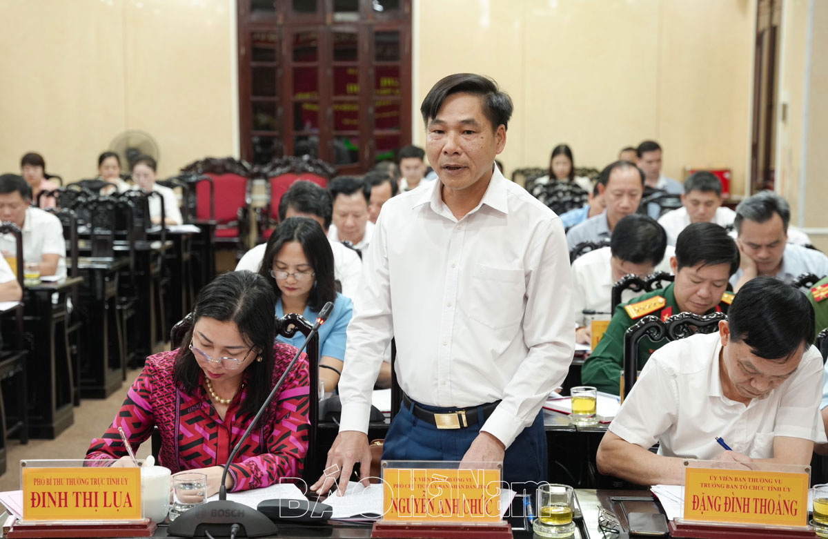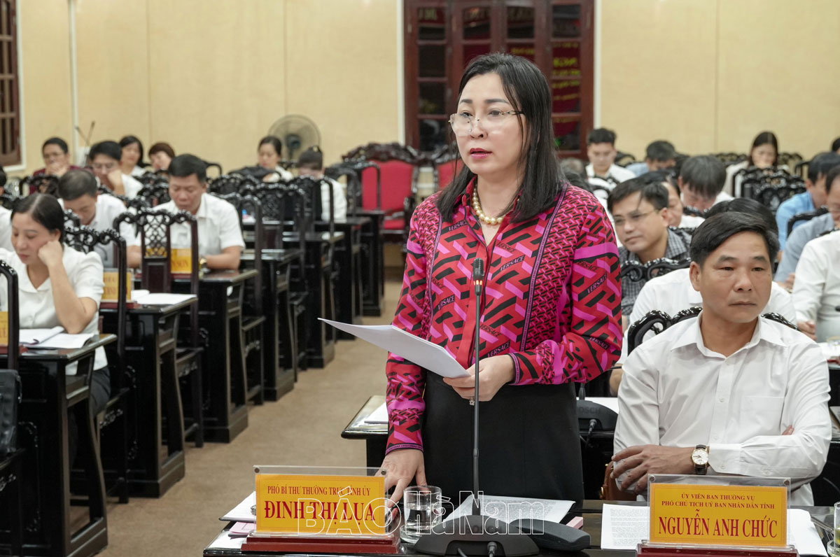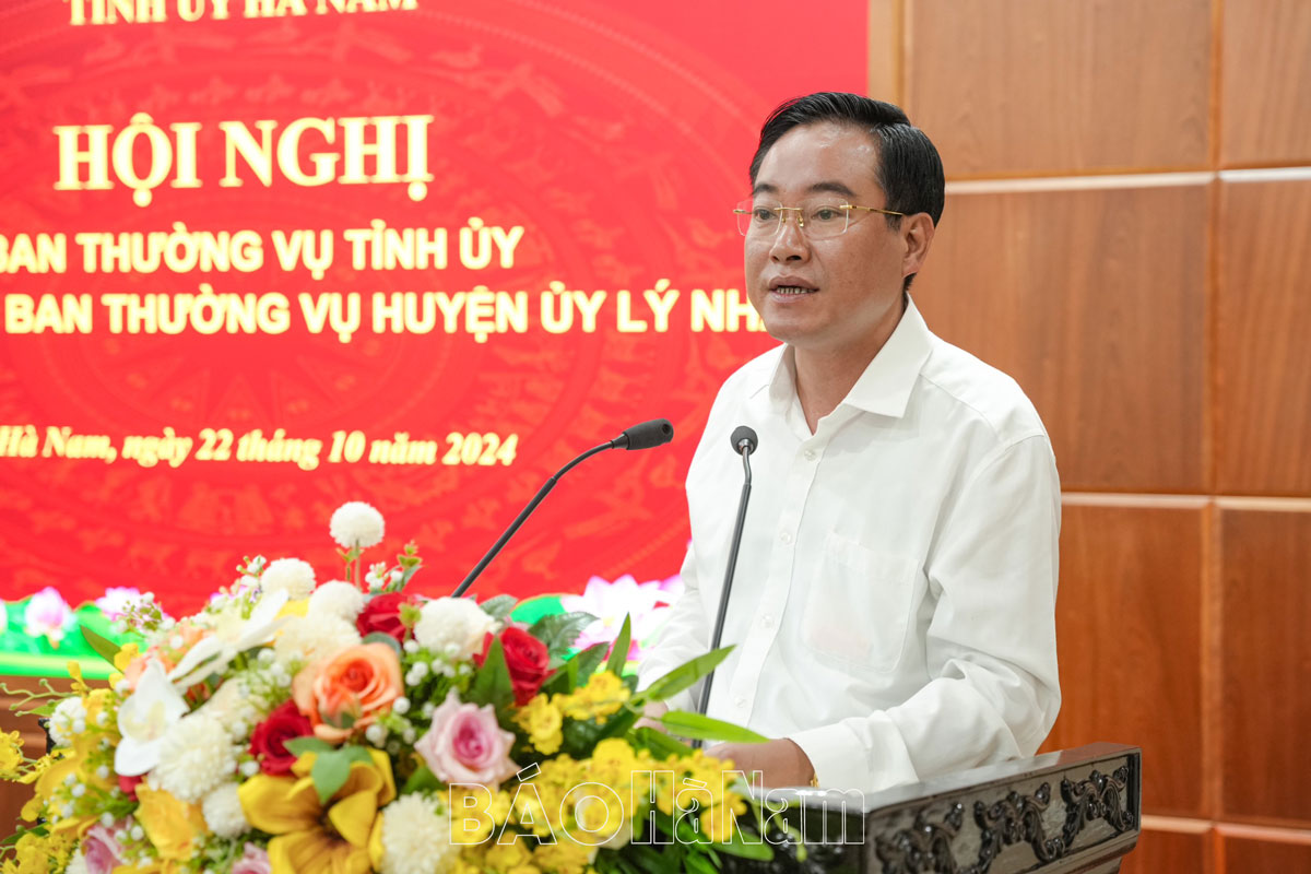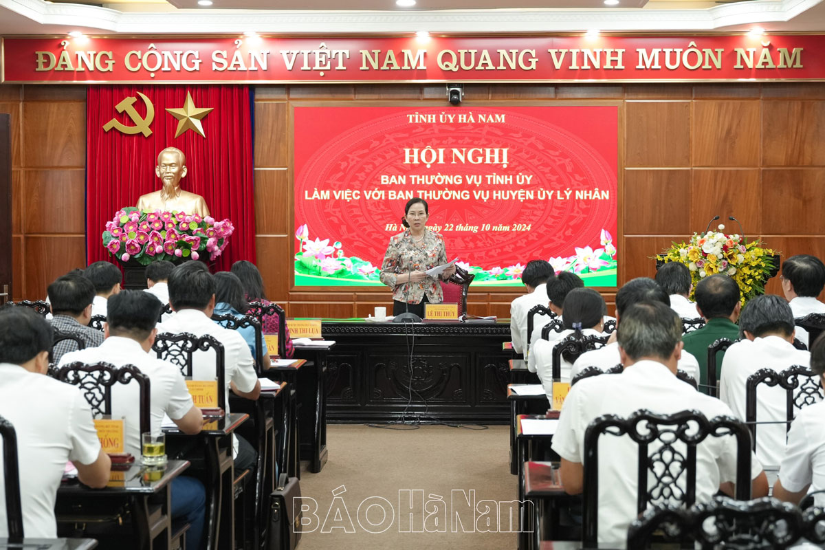 Phát biểu kết luận hội nghị, đồng chí Bí thư Tỉnh ủy Lê Thị Thủy ghi nhận sự cố gắng, nỗ lực của BTV Huyện ủy Lý Nhân trong lãnh đạo, chỉ đạo, thực hiện các chỉ tiêu, nghị quyết đại hội đảng bộ các cấp nhiệm kỳ 2020-2025 từ đầu nhiệm kỳ đến nay. Đồng chí Bí thư Tỉnh ủy đề nghị: BTV Huyện ủy tiếp tục tập trung lãnh đạo, chỉ đạo hoàn thành các mục tiêu, chỉ tiêu Nghị quyết Đại hội Đảng bộ huyện lần thứ XXVI đề ra. Trong đó, về công tác xây dựng Đảng, xây dựng hệ thống chính trị tiếp tục lãnh đạo, chỉ đạo thực hiện có hiệu quả các nghị quyết của Trung ương, nghị quyết, chương trình, đề án của Tỉnh ủy, BTV Tỉnh ủy; làm tốt công tác giáo dục chính trị, tư tưởng; đẩy mạnh thực hiện Nghị quyết Trung ương 4 (khóa XII), Kết luận số 21 ngày 25/10/2021 của BCH Trung ương về xây dựng, chỉnh đốn Đảng và hệ thống chính trị gắn với thực hiện học tập, làm theo tư tưởng, đạo đức, phong cách Hồ Chí Minh... Tăng cường củng cố, xây dựng tổ chức cơ sở đảng và nâng cao chất lượng đội ngũ đảng viên trong giai đoạn mới. Tiếp tục thực hiện tốt công tác đào tạo, bồi dưỡng, điều động, luân chuyển cán bộ để chuẩn bị nhân sự đại hội đảng bộ các cấp nhiệm kỳ 2025-2030 và bầu cử đại biểu HĐND các cấp nhiệm kỳ 2026 - 2031. Nâng cao chất lượng công tác KTGS, nhất là giám sát chuyên đề và kiểm tra dấu hiệu vi phạm; làm tốt công tác dân vận, nhất là dân vận chính quyền. Thực hiện công tác nội chính, cải cách tư pháp và phòng, chống tham nhũng, lãng phí, tiêu cực, giải quyết đơn thư khiếu nại, tố cáo. Nâng cao chất lượng, hiệu quả hoạt động của chính quyền các cấp. Tiếp tục đổi mới hoạt động của MTTQ và các đoàn thể chính trị - xã hội theo hướng bám sát cơ sở, thực chất, hiệu quả.