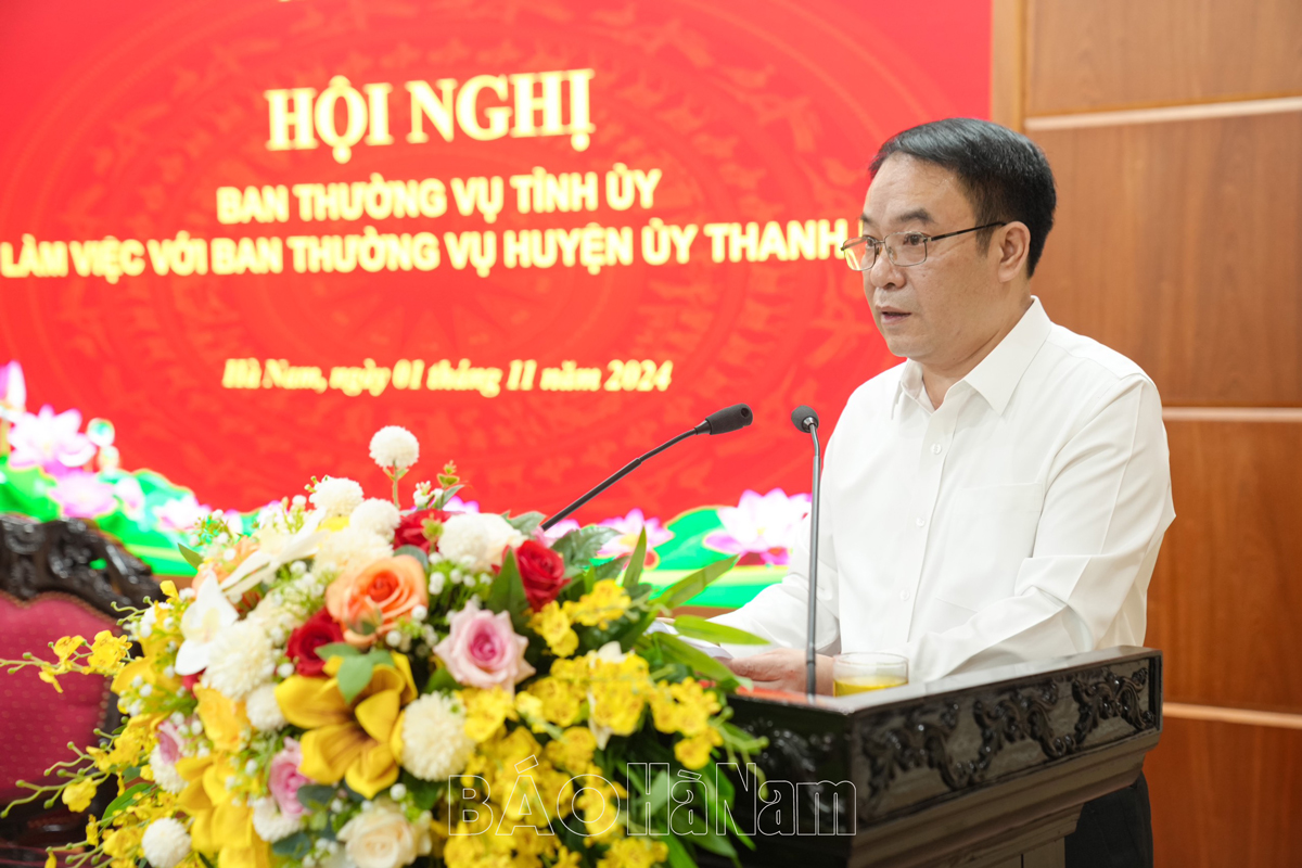 Phát biểu kết luận hội nghị, đồng chí Bí thư Tỉnh ủy Lê Thị Thủy ghi nhận sự cố gắng, nỗ lực của BTV Huyện ủy Thanh Liêm trong công tác lãnh đạo, chỉ đạo thực hiện các chỉ tiêu, nghị quyết đại hội đảng bộ các cấp nhiệm kỳ 2020 – 2025 từ đầu nhiệm kỳ đến nay. BTV Tỉnh ủy cơ bản thống nhất với phương hướng, mục tiêu, nhiệm vụ, giải pháp đã nêu như báo cáo của BTV Huyện ủy Thanh Liêm. Về nhiệm vụ thời gian tới, đồng chí Bí thư Tỉnh ủy yêu cầu: BTV Huyện ủy Thanh Liêm tiếp tục lãnh đạo, chỉ đạo thực hiện có hiệu quả các nghị quyết của Trung ương, các nghị quyết, chương trình, đề án của Tỉnh ủy, BTV Tỉnh ủy. Làm tốt công tác giáo dục chính trị, tư tưởng; đẩy mạnh thực hiện Nghị quyết Trung ương 4 (khóa XII), Kết luận số 21 của Ban Chấp hành Trung ương khóa XIII về đẩy mạnh xây dựng, chỉnh đốn Đảng và hệ thống chính trị gắn với thực hiện Chỉ thị số 05 của Bộ Chính trị về học tập và làm theo tư tưởng, đạo đức, phong cách Hồ Chí Minh. Tăng cường củng cố, xây dựng tổ chức cơ sở đảng và nâng cao chất lượng đội ngũ đảng viên trong giai đoạn mới, phấn đấu sớm hoàn thành chỉ tiêu kết nạp đảng viên (đạt từ 3% tổng số đảng viên của toàn đảng bộ trở lên). Tiếp tục thực hiện tốt công tác đào tạo, bồi dưỡng, điều động, luân chuyển cán bộ để chuẩn bị nhân sự đại hội đảng bộ các cấp nhiệm kỳ 2025-2030 và bầu cử đại biểu HĐND các cấp nhiệm kỳ 2026 - 2031. Nâng cao chất lượng công tác KTGS, thi hành kỷ luật Đảng; phát hiện, xử lý nghiêm tổ chức đảng và đảng viên vi phạm, kịp thời giải quyết đơn thư, nhất là đơn thư liên quan đến nhân sự đại hội. Làm tốt công tác dân vận, nhất là dân vận chính quyền. Nâng cao chất lượng công tác nội chính, cải cách tư pháp và phòng chống tham nhũng, lãng phí, tiêu cực. Phát huy vai trò của MTTQ và các đoàn thể chính trị - xã hội trong vận động, tập hợp các đoàn viên, hội viên thực hiện tốt các phong trào thi đua yêu nước, các cuộc vận động...