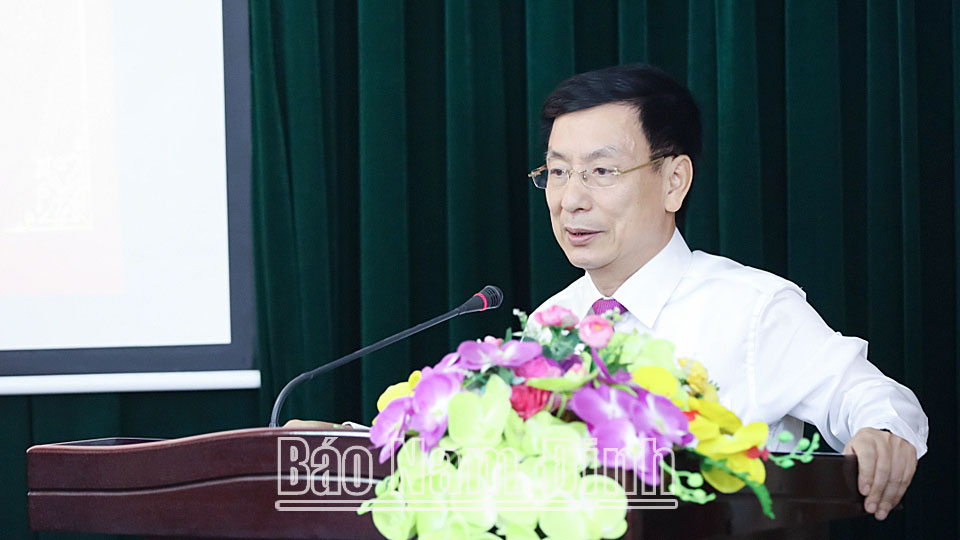 | Đồng chí Chủ tịch UBND tỉnh Phạm Đình Nghị phát biểu giao nhiệm vụ cho đồng chí Phạm Minh Tuấn, Phó Trưởng Ban Tổ chức Tỉnh ủy. |