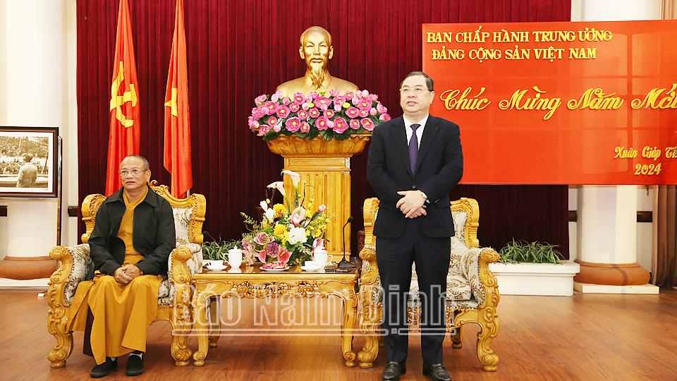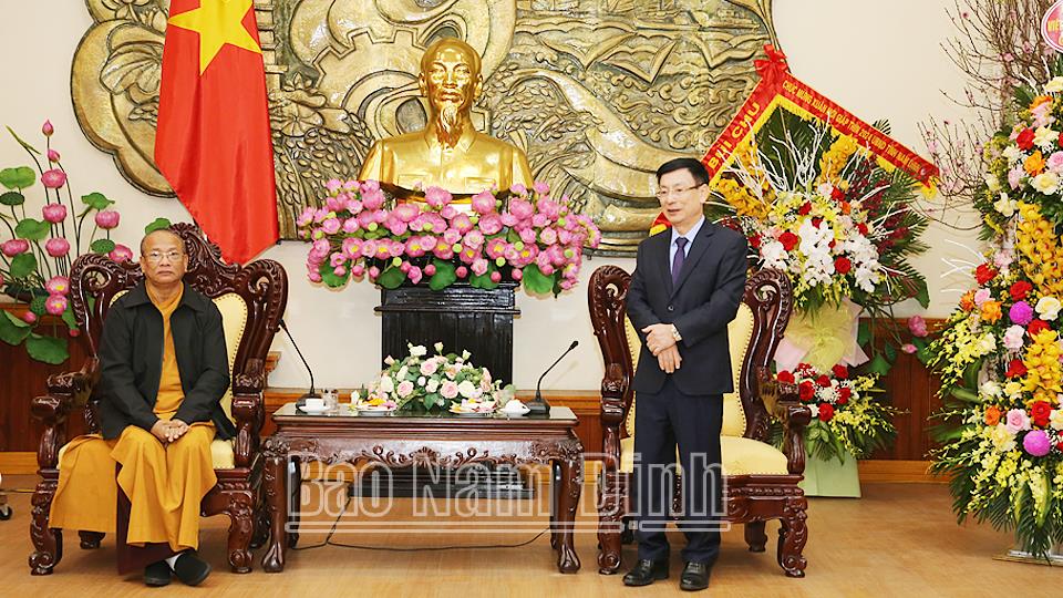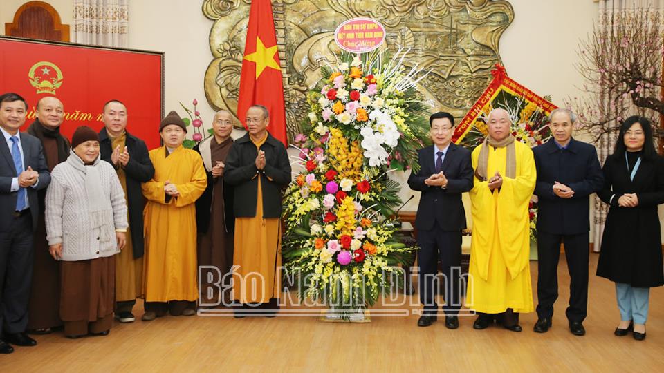 Thay mặt lãnh đạo tỉnh, đồng chí Bí thư Tỉnh ủy Phạm Gia Túc và đồng chí Chủ tịch UBND tỉnh Phạm Đình Nghị cảm ơn những lời chúc mừng tốt đẹp của Ban Trị sự Giáo hội Phật giáo tỉnh; đồng thời thông báo với đoàn về một số kết quả nổi bật trong phát triển kinh tế - xã hội Nam Định đạt được trong năm 2023. Cụ thể, năm qua tỉnh đạt được nhiều kết quả quan trọng, khá toàn diện trên tất cả các lĩnh vực; là năm thành công, tạo dấu ấn đậm nét và ấn tượng nhất. Tổng sản phẩm GRDP tăng 10,19% cao nhất từ trước đến nay, đứng thứ 3 vùng đồng bằng sông Hồng và thứ 6 cả nước. Đồng chí Bí thư Tỉnh ủy và đồng chí Chủ tịch UBND tỉnh khẳng định, những kết quả đạt được trong năm qua là nỗ lực, quyết tâm của Đảng bộ, chính quyền và nhân dân, trong đó có sự đồng hành của Ban Trị sự Giáo hội Phật giáo tỉnh cùng đông đảo phật tử trong tỉnh. Các đồng chí mong rằng năm 2024 cũng như các năm tiếp theo, Ban Trị sự Giáo hội Phật giáo tỉnh tiếp tục phát huy kết quả, truyền thống tốt đẹp, xây dựng khối đại đoàn kết dân tộc ngày càng bền chặt, đồng hành cùng cấp ủy, chính quyền, MTTQ tuyên truyền, vận động nhân dân thực hiện tốt các nhiệm vụ chính trị của tỉnh, nhất là trong công tác giải phóng mặt bằng thực hiện các dự án trọng điểm tạo động lực cho tỉnh phát triển nhanh và bền vững.