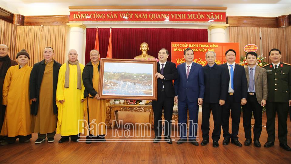 | Các đồng chí: Bí thư Tỉnh ủy Phạm Gia Túc; Lê Quốc Chỉnh, Phó Bí thư Thường trực Tỉnh ủy, Chủ tịch HĐND tỉnh, Trưởng đoàn Đoàn đại biểu Quốc hội tỉnh và các đồng chí lãnh đạo tỉnh tặng Ban Trị sự Giáo hội Phật giáo tỉnh bức ảnh Vườn quốc gia Xuân Thủy. |