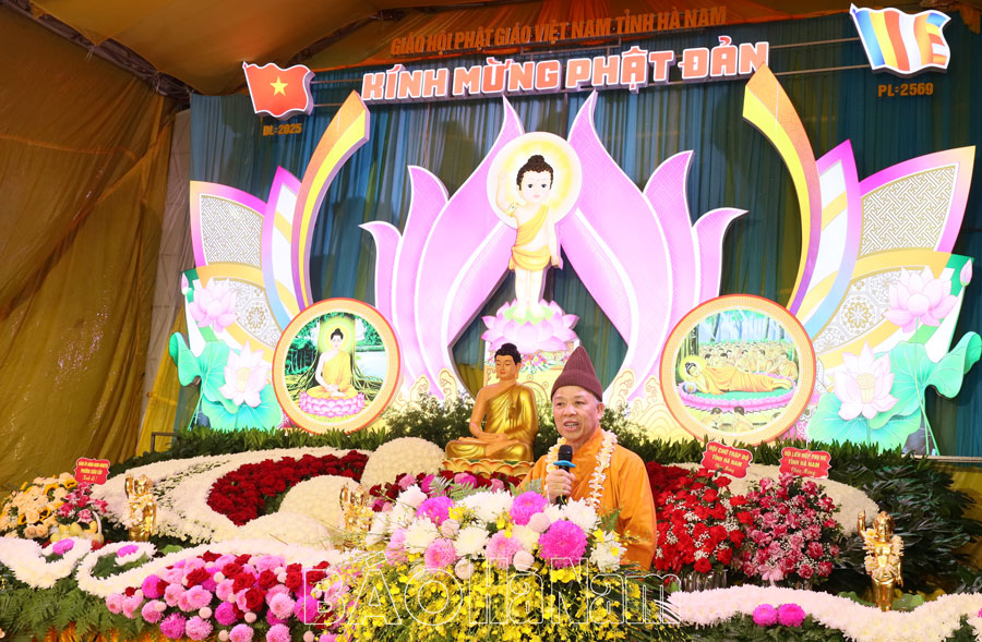 Sau lễ thỉnh Phật cầu gia hộ, cầu quốc thái dân an, toàn thể hội chúng lắng nghe Thượng tọa Thích Thiện Hưởng, Phó Trưởng Ban Thường trực Ban Trị sự Giáo hội Phật giáo tỉnh Hà Nam đọc bức Thông điệp Đại lễ Phật đản PL2569 của Đức Pháp chủ Giáo hội Phật giáo Việt Nam.