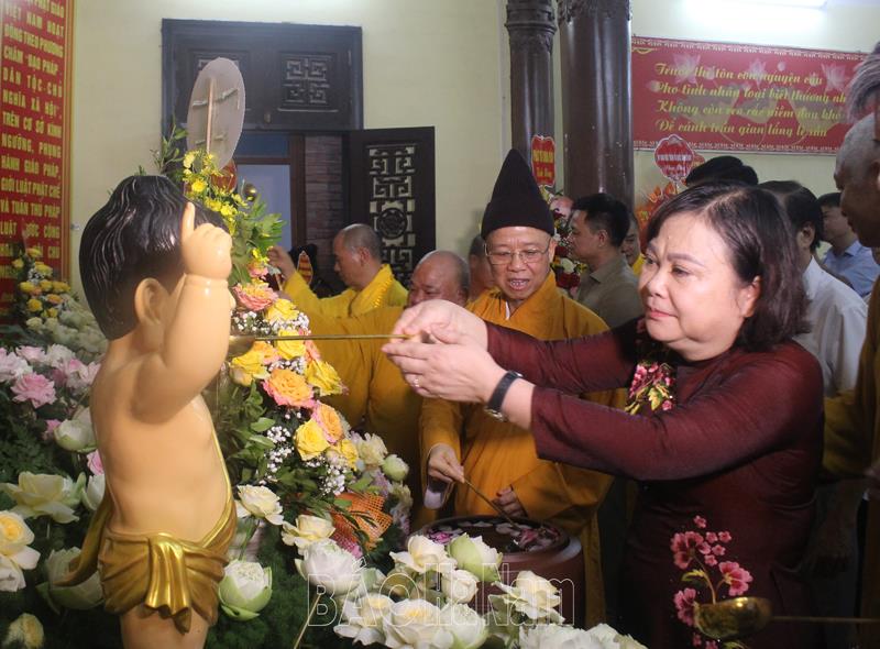 Dưới sự hướng dẫn của Chư tôn đức tăng, các đại biểu, phật tử đã thành kính thực hiện nghi thức tắm Phật. Tắm Phật là để niệm ân tới ân đức của Ngài; đồng thời, để tẩy rửa ba nghiệp Thân – Khẩu – Ý của chúng ta được trong sạch, bớt đi Tham – Sân – Si.