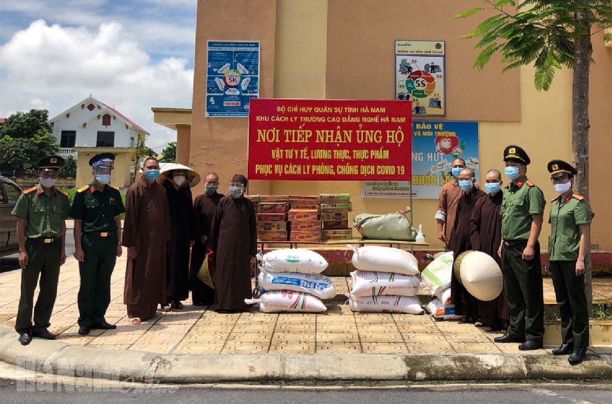 Nhằm chung tay chia sẻ với lực lượng tuyến đầu chống dịch và bà con trở về từ thành phố Hồ Chí Minh đang cách ly phòng dịch, Ban Trị sự Phật giáo huyện Bình Lục vừa tới thăm, tặng quà khu cách ly tập trung phòng chống dịch Covid-19 tại Trường Cao đẳng nghề Hà Nam.