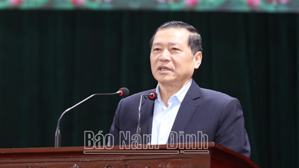 | Đồng chí Lại Xuân Môn, Ủy viên BCH Trung ương Đảng, Phó Trưởng ban Thường trực Ban Tuyên giáo Trung ương, Chủ tịch Hội đồng Khoa học các cơ quan Đảng Trung ương phát biểu tại buổi lễ tặng quà tại huyện Nam Trực. |