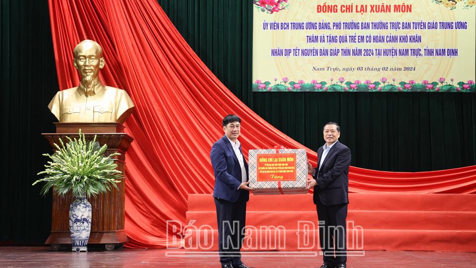 Kỷ niệm 94 năm Ngày thành lập Đảng Cộng sản Việt Nam (3-2-1930 - 3-2-2024), chuẩn bị đón Tết Nguyên đán Giáp Thìn 2024, chiều 3-2, Đoàn công tác của Ban Tuyên giáo Trung ương do đồng chí Lại Xuân Môn, Ủy viên BCH Trung ương Đảng, Phó Trưởng ban Thường trực Ban Tuyên giáo Trung ương, Chủ tịch Hội đồng Khoa học các cơ quan Đảng Trung ương làm Trưởng đoàn đã về thăm, tặng quà các gia đình chính sách, hộ nghèo, trẻ em có hoàn cảnh khó khăn tại huyện Nam Trực và thành phố Nam Định. Cùng tham gia Đoàn có các đồng chí: Vũ Thanh Mai, Phó Trưởng Ban Tuyên giáo Trung ương; Phạm Thị Thu Hằng, Ủy viên Ban TVTU, Trưởng Ban Tuyên giáo Tỉnh ủy; lãnh đạo huyện Nam Trực và thành phố Nam Định.
