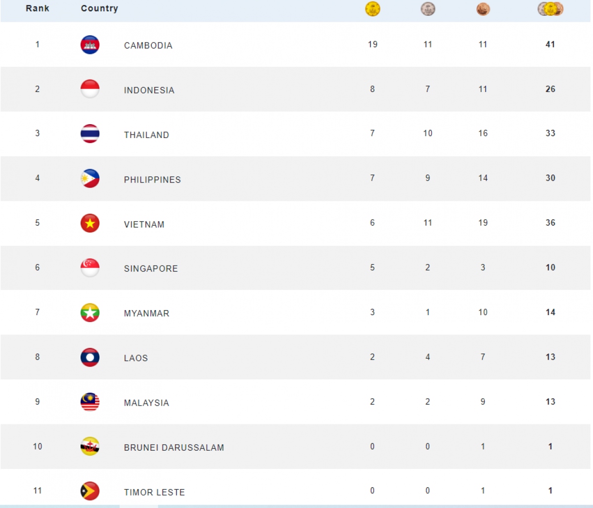 Theo bảng tổng sắp huy chương SEA Games 32 mới nhất, Đoàn chủ nhà Campuchia đang có sự bứt phá mạnh mẽ. 14 HCV giành được trong ngày thi đấu chính thức đầu tiên giúp đoàn chủ nhà sở hữu 17 HCV, bỏ xa đoàn thứ 2 là Indonesia đến 11 HCV. Ngoài 19 HCV, Đoàn Campuchia còn sở hữu 10 HCB và 10 HCĐ.