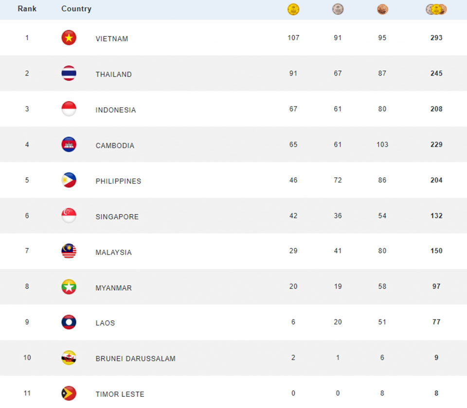 Theo bảng tổng sắp huy chương SEA Games 32 mới nhất, Đoàn Thể thao Việt Nam tiếp tục củng cố vị trí dẫn đầu với 107 HCV, 91 HCB và 94 HCĐ. Các VĐV Việt Nam cũng là đoàn duy nhất có trên 100 HCV tính đến thời điểm hiện tại.