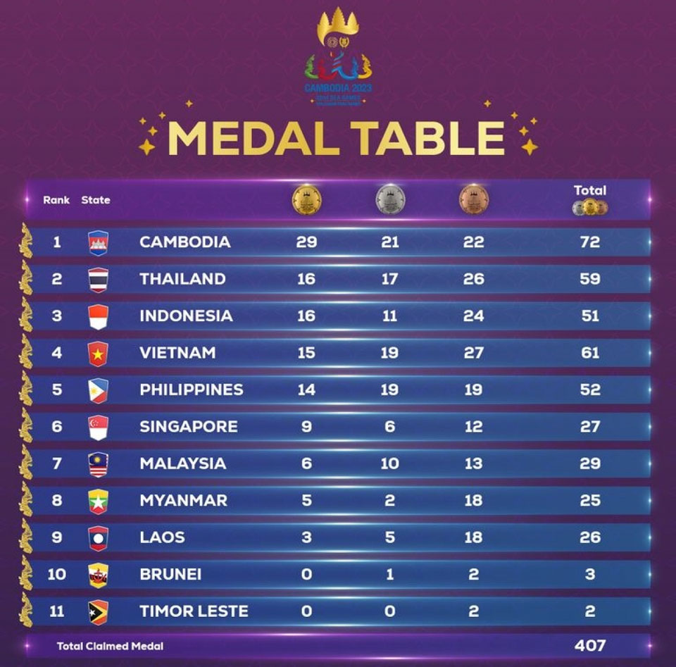 Theo bảng tổng sắp huy chương SEA Games 32 sau ngày 7/5 do BTC công bố, chủ nhà Campuchia đang dẫn đầu với 29 HCV. Đoàn Thể thao Thái Lan có cùng 16 HCV như Indonesia, nhưng xếp trên do hơn về số lượng HCB (17 so với 11).