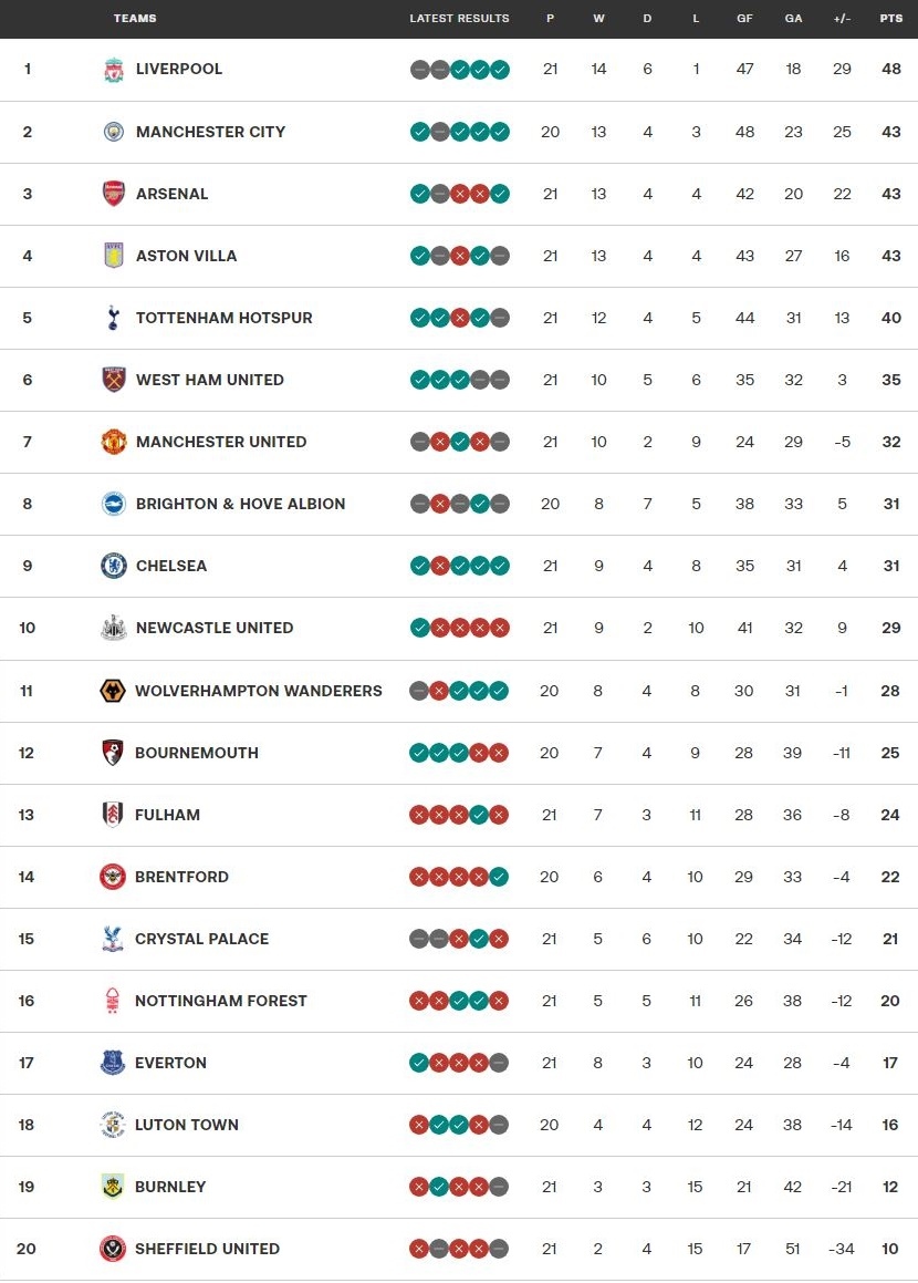 Bảng xếp hạng Ngoại hạng Anh mới nhất: Liverpool củng cố ngôi đầu
