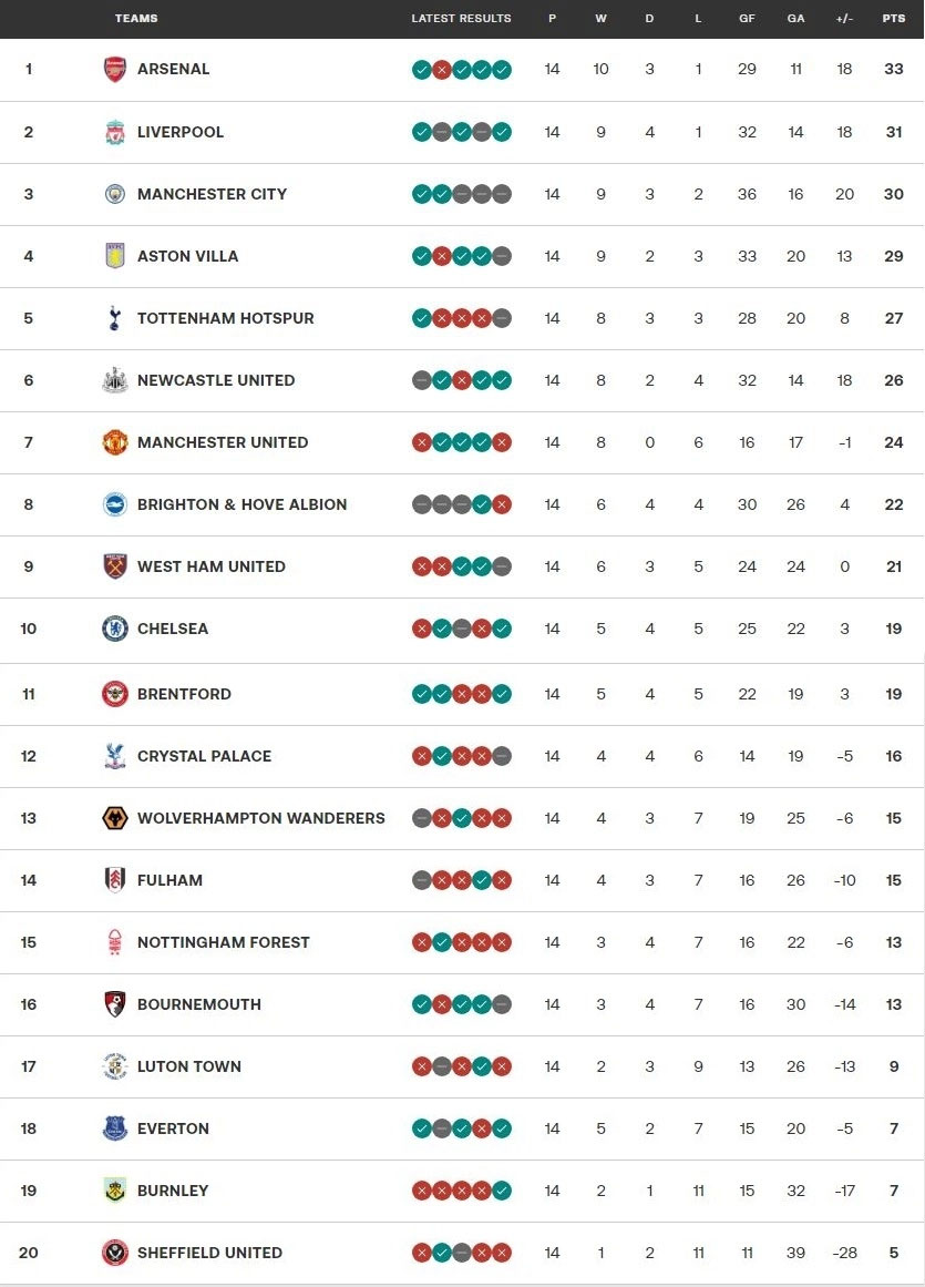 Bảng xếp hạng Ngoại hạng Anh mới nhất: Liverpool lên nhì bảng, MU xa rời top 4