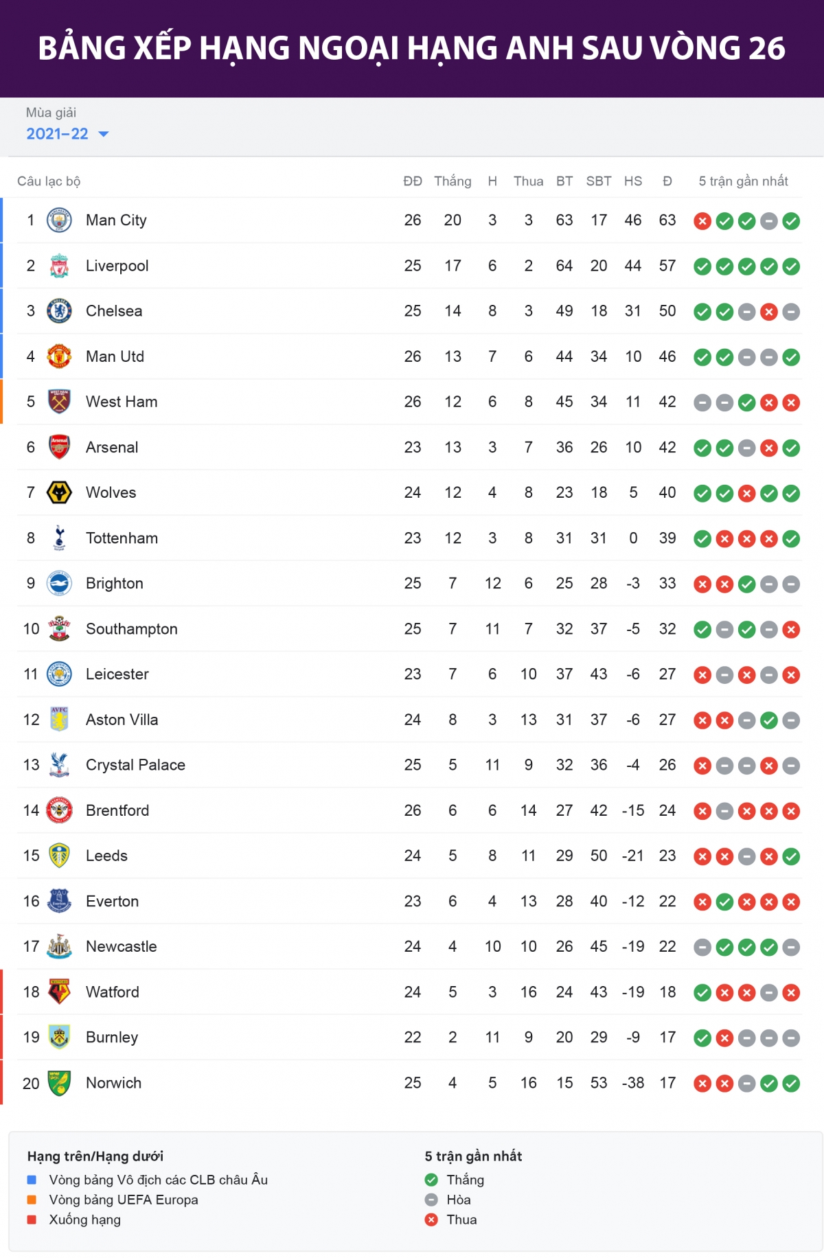 Cập nhật bảng xếp hạng Ngoại hạng Anh sau vòng đấu 26, Man City dẫn đầu với 63 điểm, hơn Liverpool đội đứng sau 6 điểm, nhưng đá nhiều hơn 1 trân. Chelsea và MU chia nhau 2 vị trí thứ 3 và thứ 4. Ở nhóm cuối bảng là sự góp mặt của Watford, Burnley và Norwich City./.