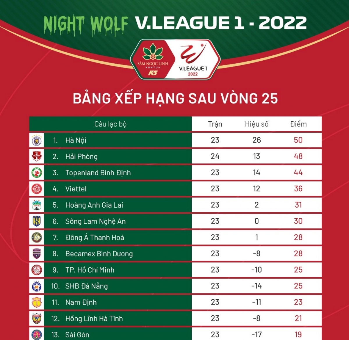 Bảng xếp hạng V-League 2022 mới nhất, Hà Nội FC vô địch sớm 1 vòng, cuộc đua trụ hạng vẫn căng thẳng giữa Hà Tĩnh và Sài Gòn FC.