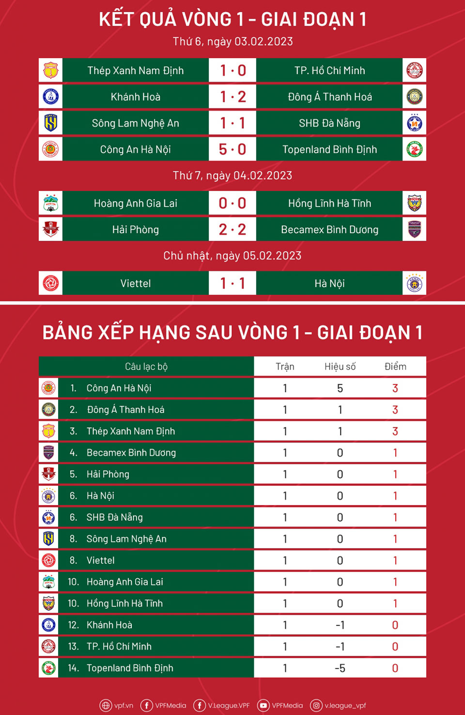 Bảng xếp hạng V-League 2023 sau vòng 1: CAHN gây ấn tượng mạnh