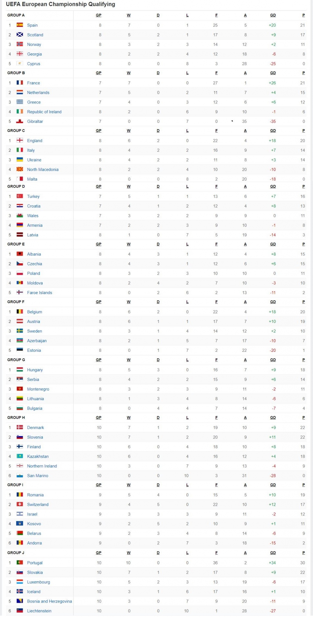 Tính tới sáng ngày 21/11 (giờ Việt Nam) đã xác định được 20/24 đội dự VCK EURO 2024 gồm Đức (chủ nhà), Bỉ (bảng F), Pháp (bảng B), Bồ Đào Nha (bảng J), Tây Ban Nha (bảng A), Scotland (bảng A), Thổ Nhĩ Kỳ (bảng D), Áo (bảng F), Anh (bảng C), Hungary (bảng G), Slovakia (bảng J), Albania (bảng E), Đan Mạch (bảng H), Hà Lan (bảng B), Romania (bảng I), Thụy Sĩ (bảng I), Serbia (bảng G), CH Séc (bảng E), Slovenia (bảng H) và Italia (bảng C).