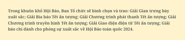 Cũng theo đồng chí Lê Quốc Minh, trong khuôn khổ Hội Báo toàn quốc năm 2024, lần đầu tiên Diễn đàn Báo chí toàn quốc sẽ được tổ chức với 10 phiên thảo luận về các chủ đề trọng yếu, có tính cấp bách của nền báo chí cách mạng Việt Nam trong thời kỳ chuyển đổi số, như: nâng cao tính Đảng, tính định hướng trong hoạt động báo chí; xây dựng môi trường văn hóa báo chí; báo chí dữ liệu và chiến lược nội dung vượt trội; năng lực cạnh tranh của truyền hình trong thời đại AI; phát thanh năng động trong môi trường số; đa dạng hóa nguồn thu các cơ quan báo chí, vấn đề bảo vệ bản quyền báo chí trong kỷ nguyên số…