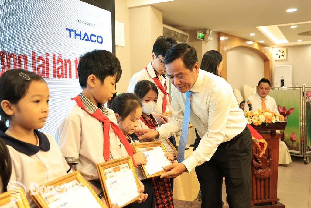 | Phó trưởng ban Tuyên giáo Tỉnh ủy Phạm Tấn Linh cũng đại diện Công ty CP Tập đoàn Trường Hải trao quà cho các em học sinh. |
