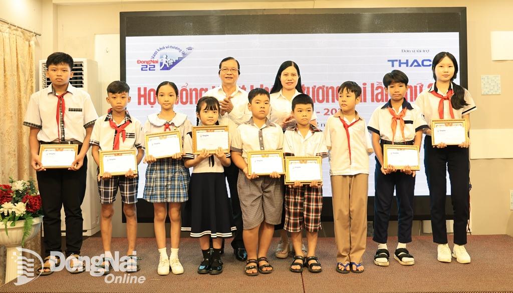 | Phó tổng biên tập Báo Đồng Nai Hoàng Thị Bích Phú và Phó chủ tịch thường trực Hội Nhà báo tỉnh Hồ Văn Chừng trao học bổng cho các em học sinh. |