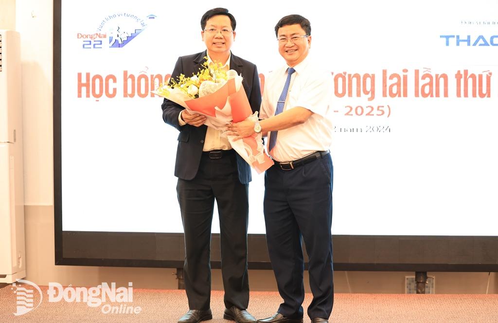 | Tổng biên tập Báo Đồng Nai Đào Văn Tuấn trao hoa cảm ơn đại diện Công ty CP Tập đoàn Trường Hải đã tiếp tục đồng hành với chương trình học bổng Vượt khó vì tương lai. |